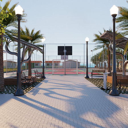 Praça pública com 1.797m², projetada dentro dos princípios do urbanismo contemporâneo, com influência modernista. O desenho prioriza calçadas largas, espaços simétricos e a valorização dos equipamentos públicos, como playground inclusivo, quadra poliesportiva e academia ao ar livre. Com paisagismo funcional e soluções sustentáveis, o espaço foi pensado para promover lazer, esporte, convivência e pertencimento à comunidade.