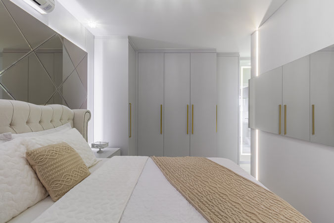Detalhes Principais: mescla de cores neutras e quentes, uso de mdf amadeirado e iluminação quente.
